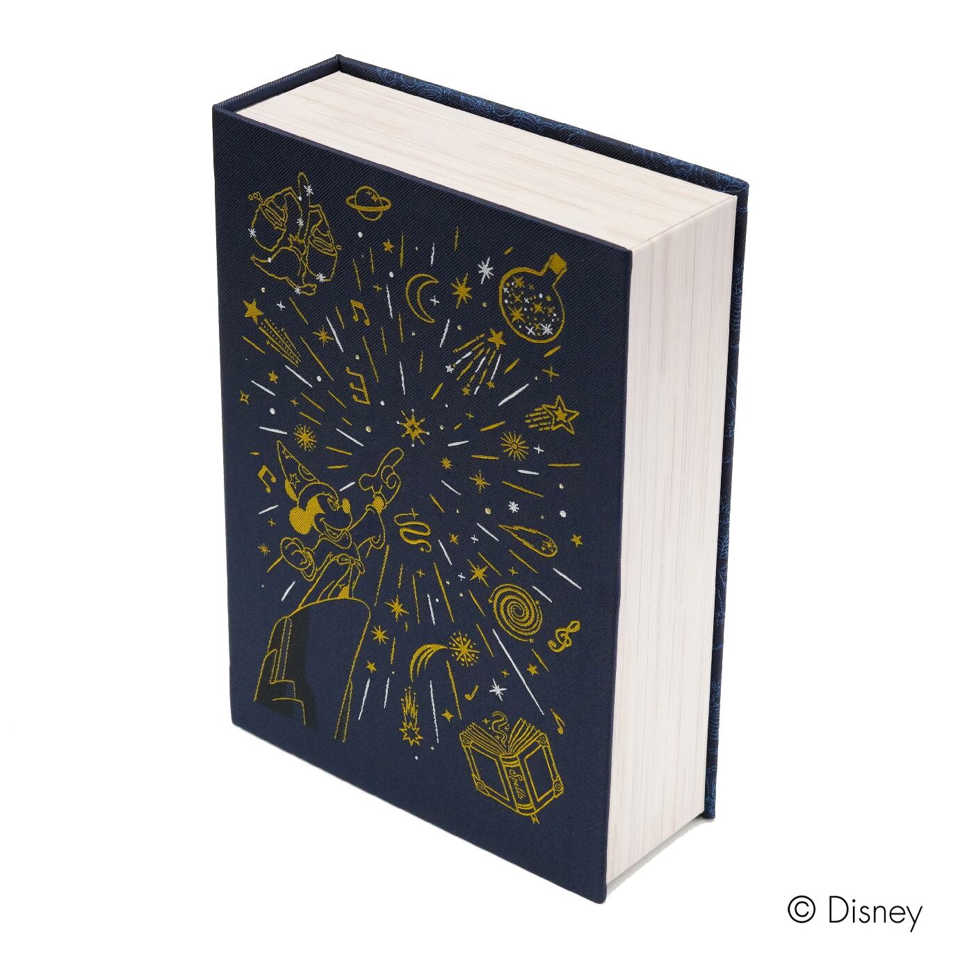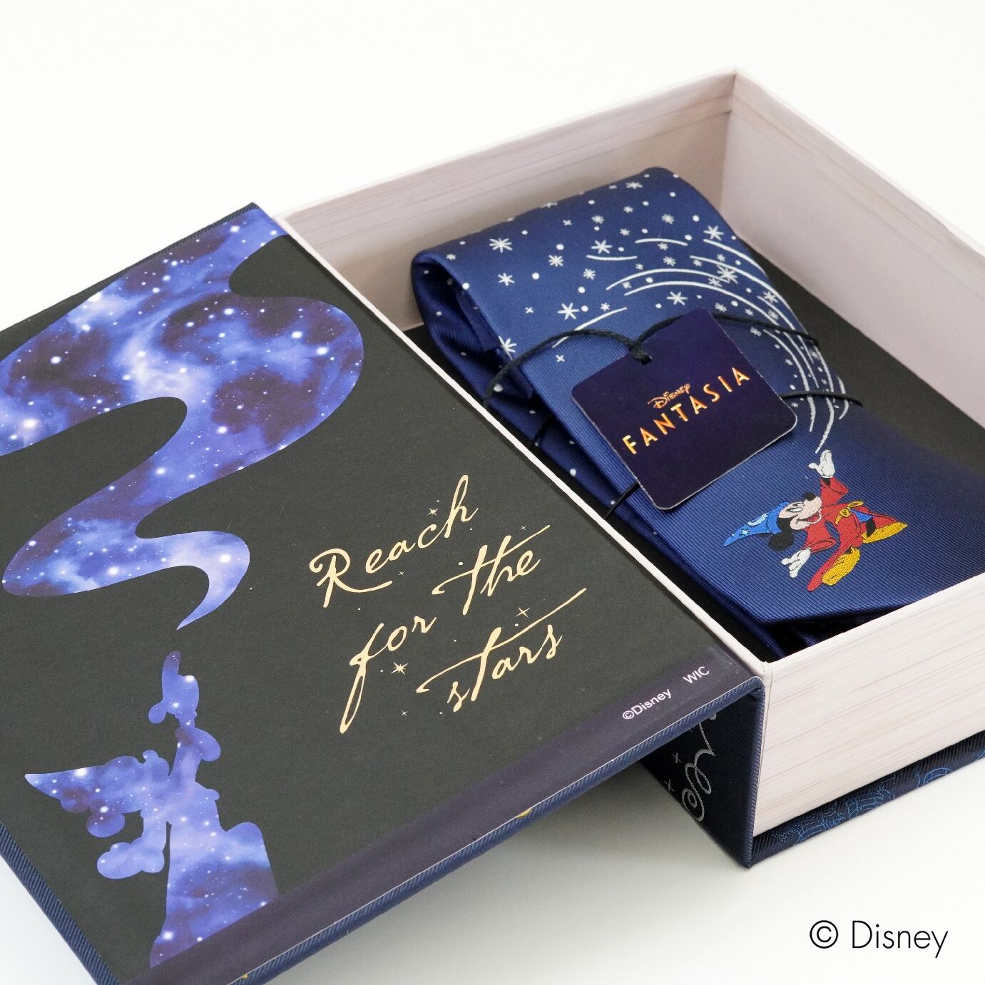 ネクタイは、物語をイメージした特製ブック型BOXに収めてお届け。表紙にはミッキーが魔法を放つ姿と星や楽譜などのモチーフが散りばめられ、まるで本を開くようなワクワク感を演出します。