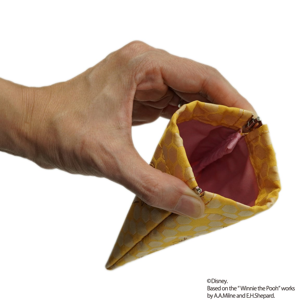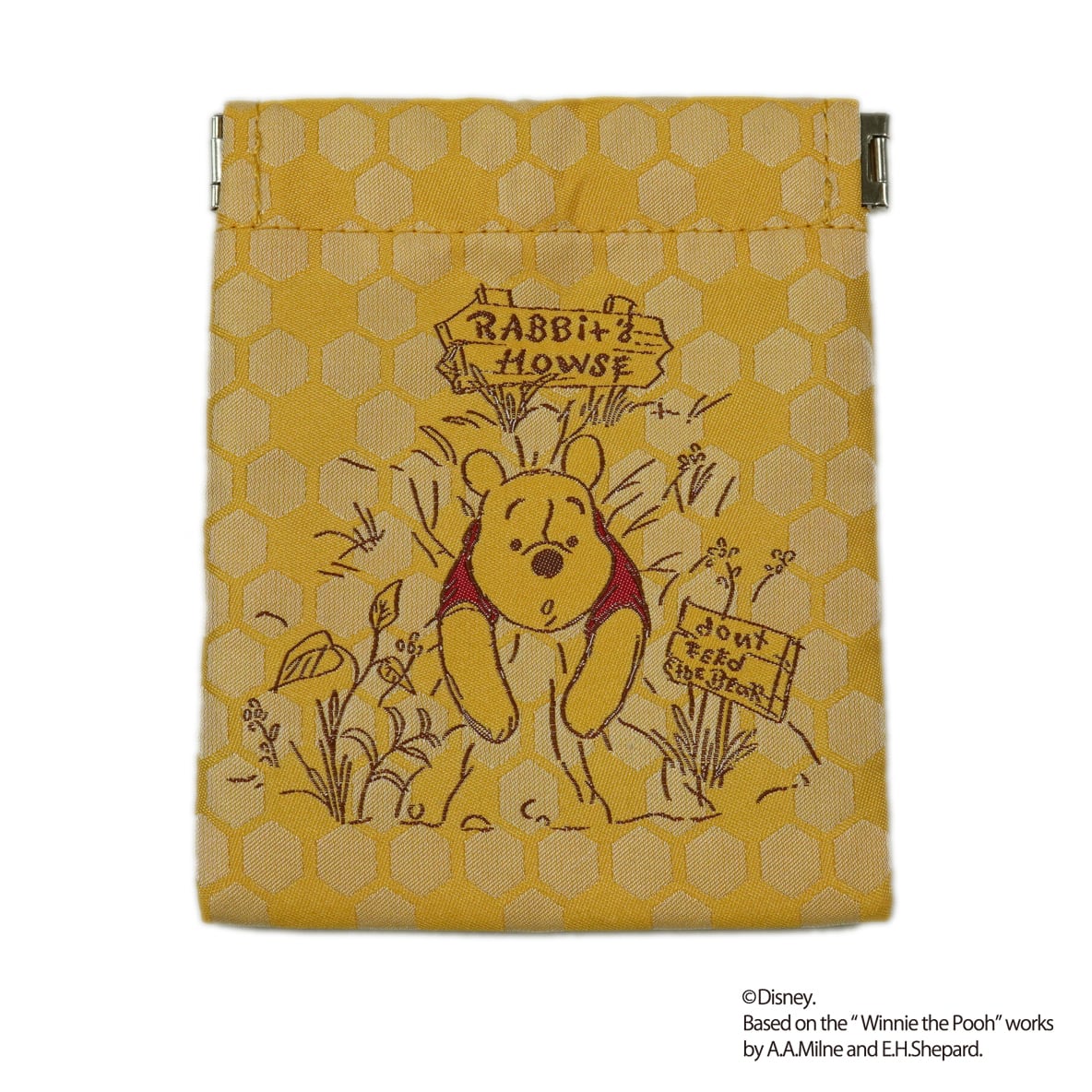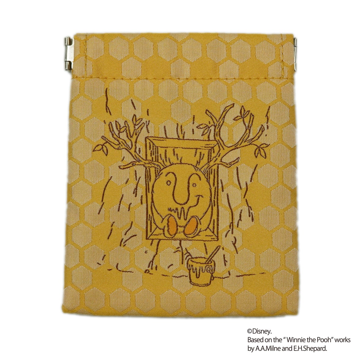 くまのプーさんがハチミツを食べすぎて、穴にはまってしまったユーモラスなシーンをデザインしたばねぐちポーチです。